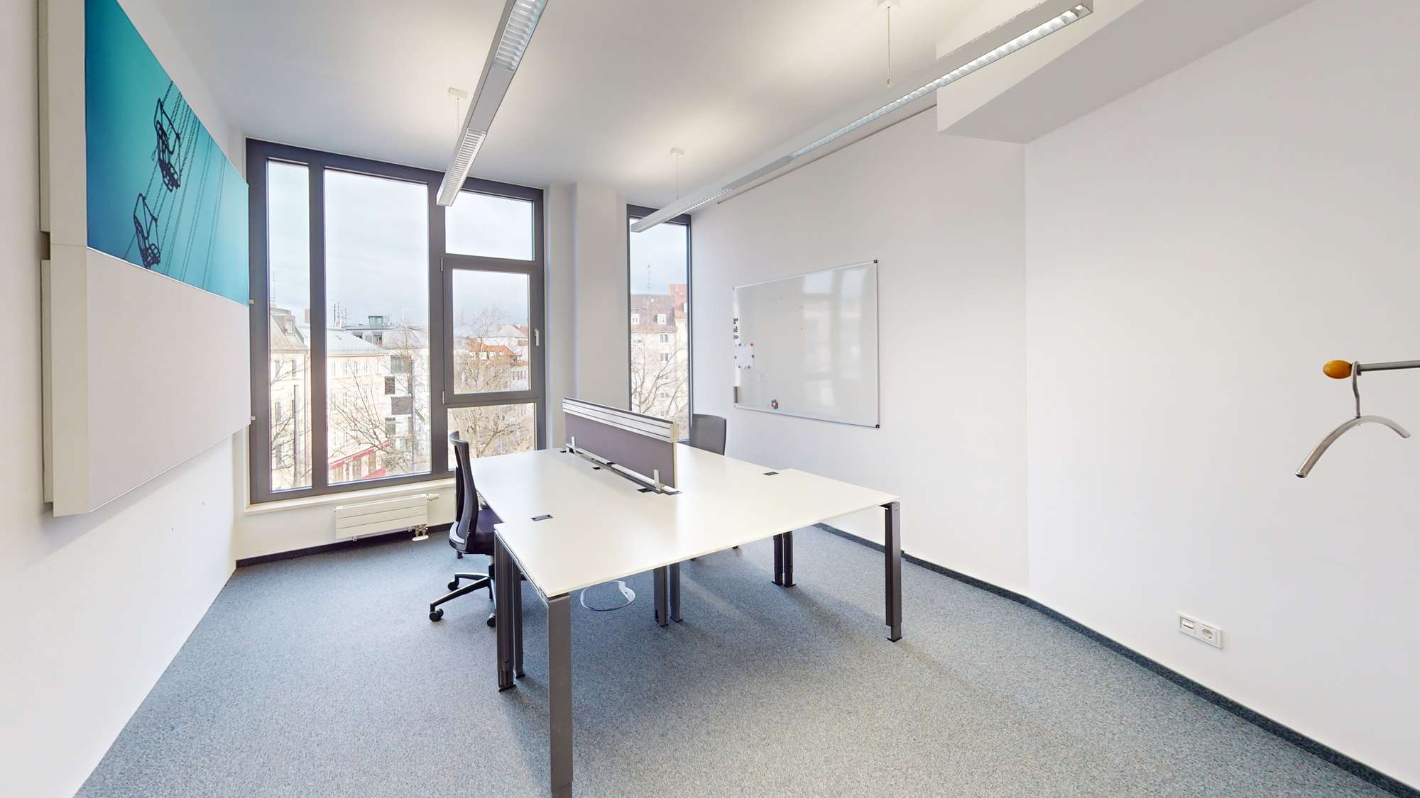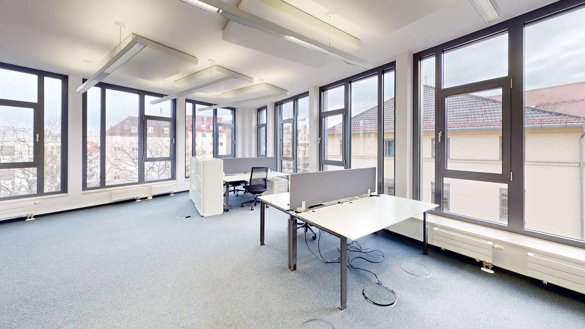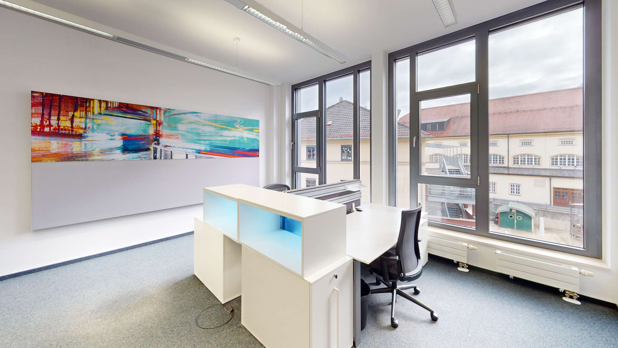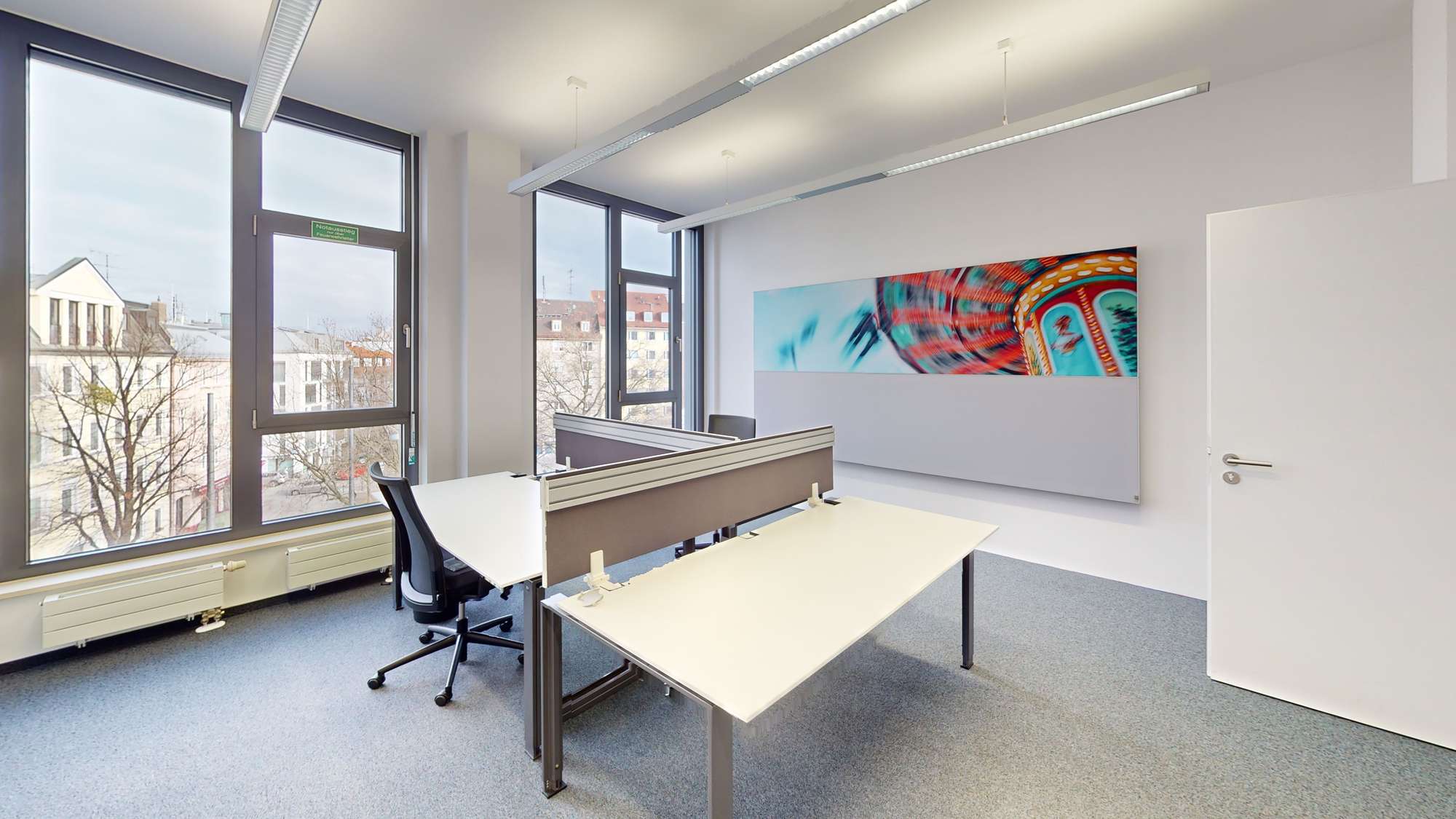 - Möblierung inkl.: 20 Schreibtische, 20 Bürostühle, Abschließbare Schränke, Whiteboard, Akustik-Bilder