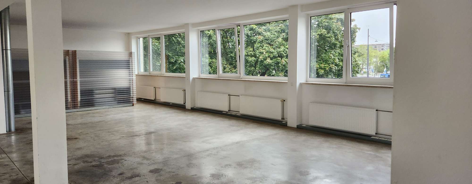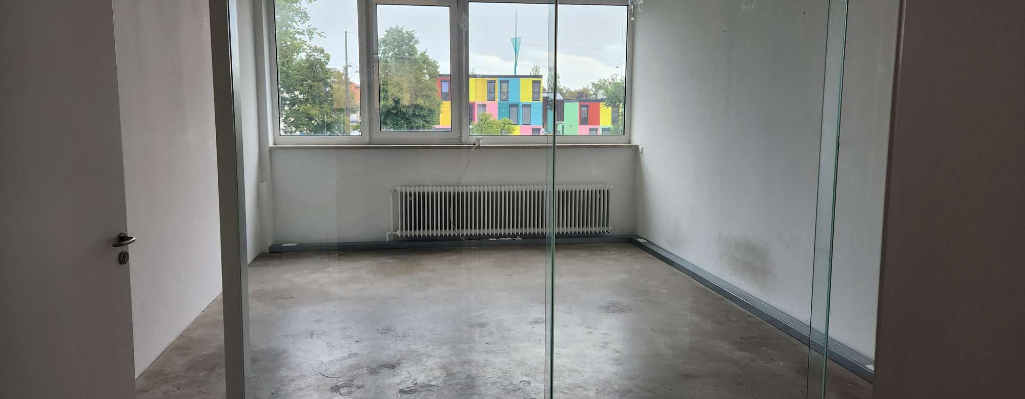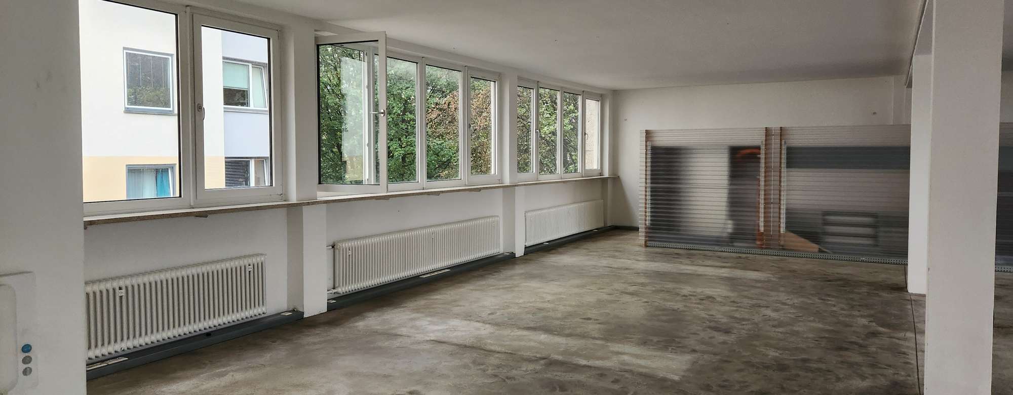 ↵↵Die Gewerbefläche wurde auch bislang als Büro genutzt. Große Fenster an den beiden Außenmauern sorgen für eine gute natürliche Beleuchtung und Belüftung.