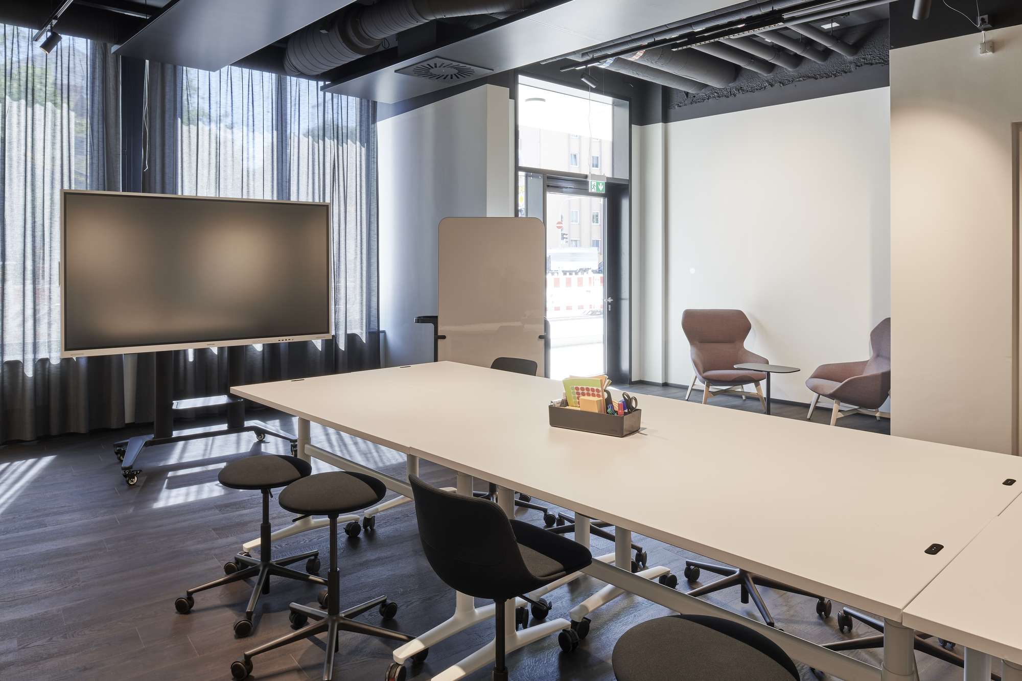 Unser Meetingraum "Create Room" ist perfekt für Agile Workshops, Seminare und Tagungen. Es bietet eine ruhige und professionelle Arbeitsumgebung, die durch moderne Möbel, Ausstattung und hochwertige Medientechnik ergänzt wird.