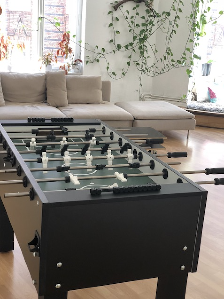 - ein gemütlicher Meetingraum mit Meetingtisch, Sofaecke, Kicker, Beamer, Meeting TV