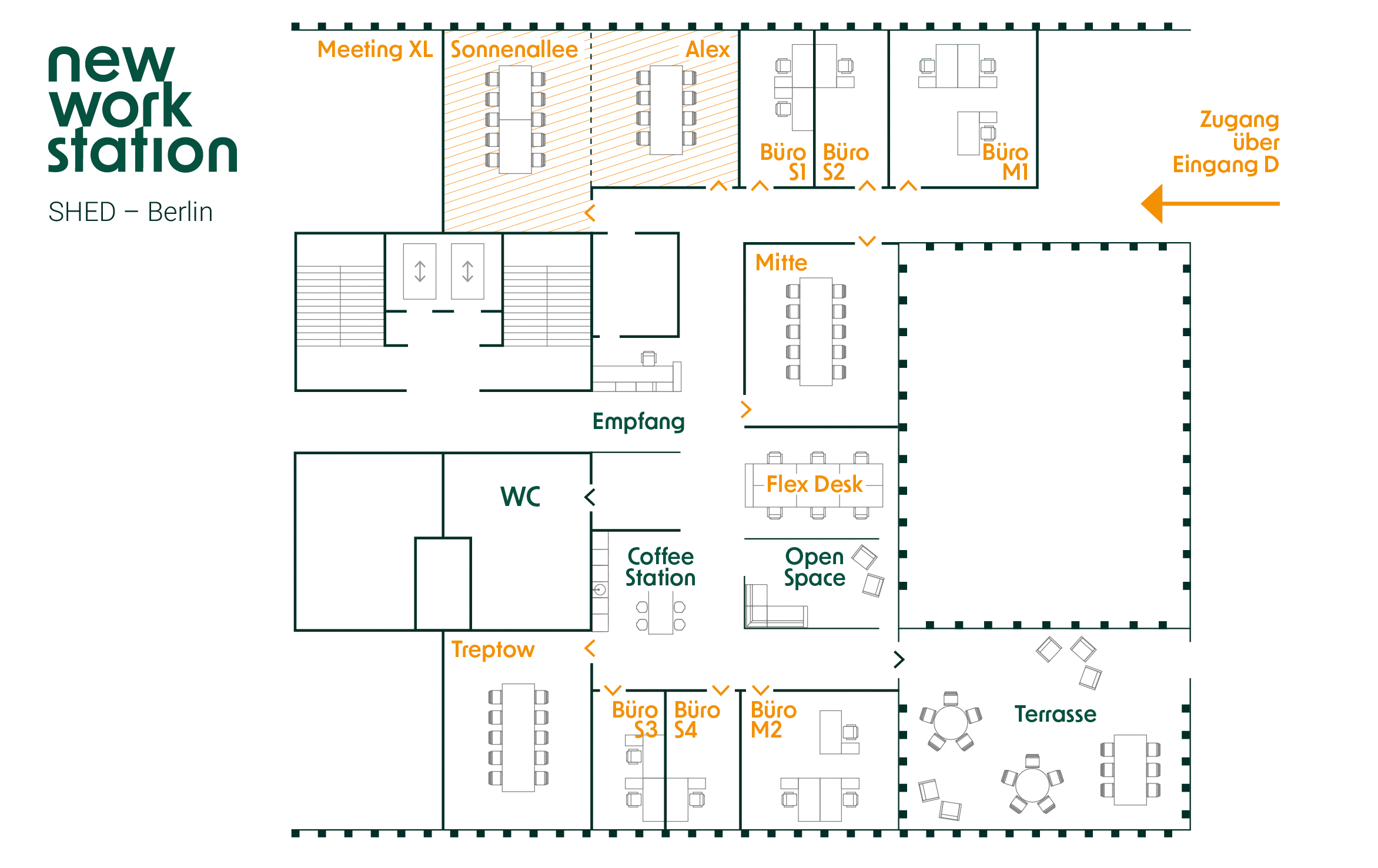Der Meetingraum Treptow befindet sich am Berliner Standort der New Work Station im SHED direkt am Neuköllner Schifffahrtskanal gelegen und sorgt für eine passende Umgebung für Veranstaltungen wie beispielsweise Brainstormings, Meetings, Workshops oder Offsite Meetings. Auch für Coachings und Kundengespräche eignet sich unser Raum hervorragend.↵↵Das bieten wir dir:↵↵Moderner Besprechungsraum mit Platz für 8 bis 12 Personen