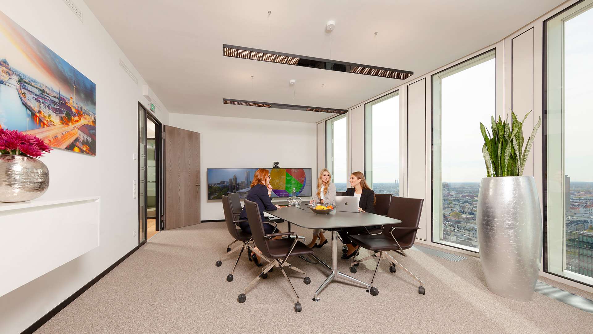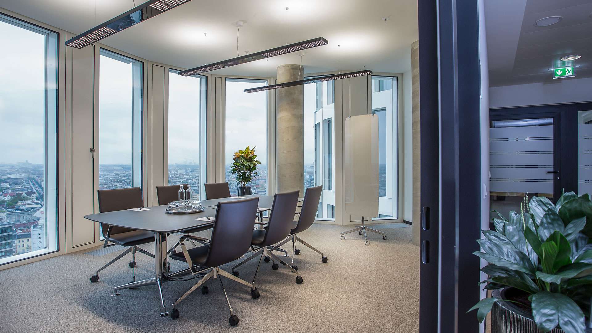 Genießen Sie mit Ihren Gästen den spektakulären Blick aus der 25. Etage auf das berühmte Kranzler Eck bis hin zum Funkturm. Dieser komfortable, Besprechungsraum bietet Ihnen Platz für bis zu 8 Personen. Hochwertig ausgestattet mit einem Konferenztisch aus Echtholz sowie komfortablen Stühlen. Zwei moderne Flatscreens sorgen für perfekte Voraussetzungen für Ihre Full-HD Videokonferenz (gegen Aufpreis). W-LAN steht Ihnen kostenfrei zur Verfügung. Mineralwasser, Softdrinks, Tee und Kaffeespezialitäten, sowie Catering stellen wir Ihnen gerne bereit. Die Abrechnung erfolgt nach Verbrauch oder als Pauschale. Das freundliche Servicepersonal steht Ihnen jederzeit zur Verfügung und unterstützt Sie gerne.