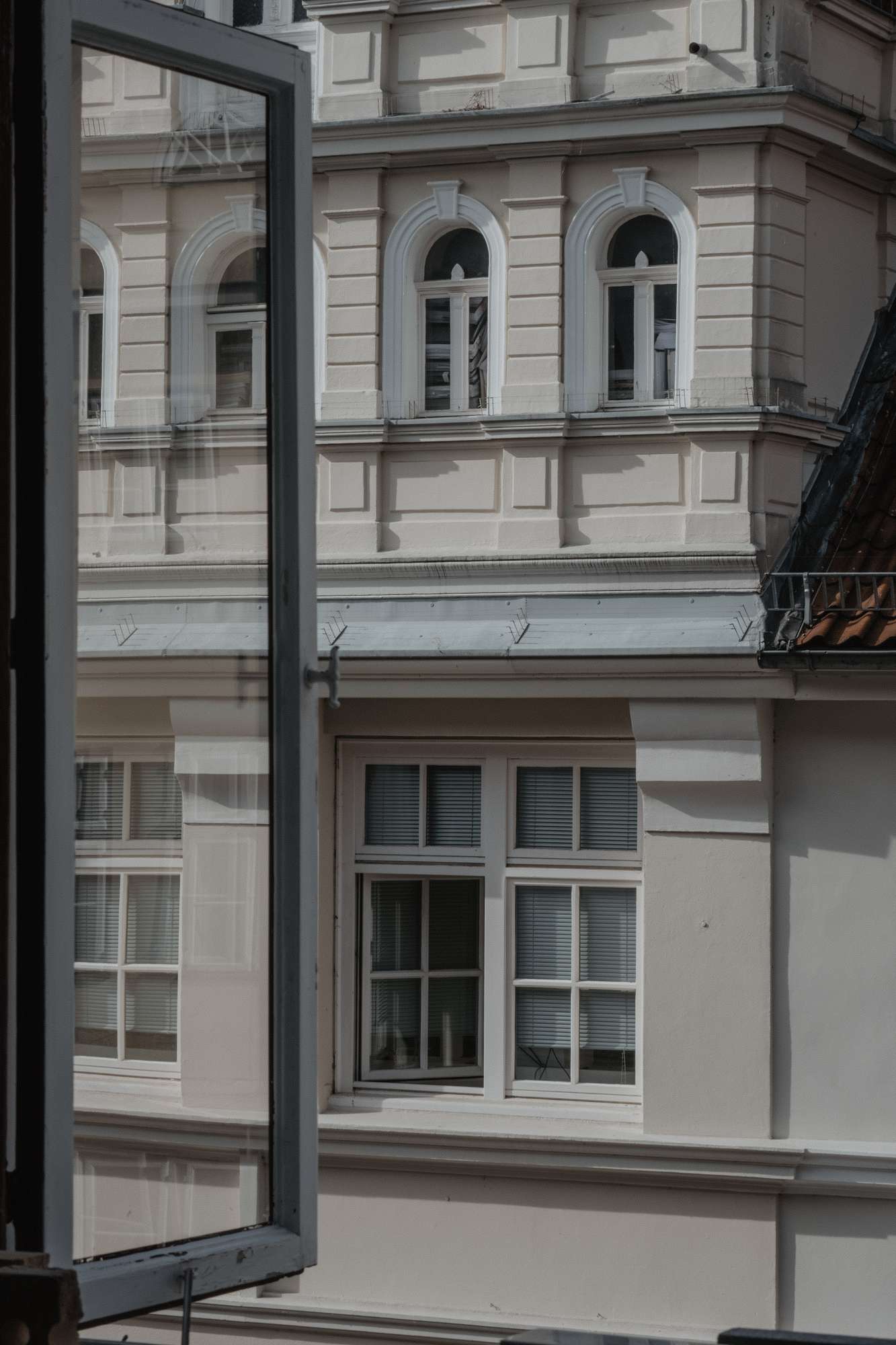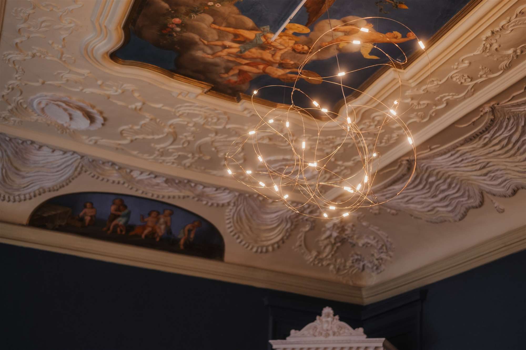 Der Saal hat eine wunderschöne Stuckdecke mit tollen Fresken und viel Tageslicht durch eine große Fensterfront.