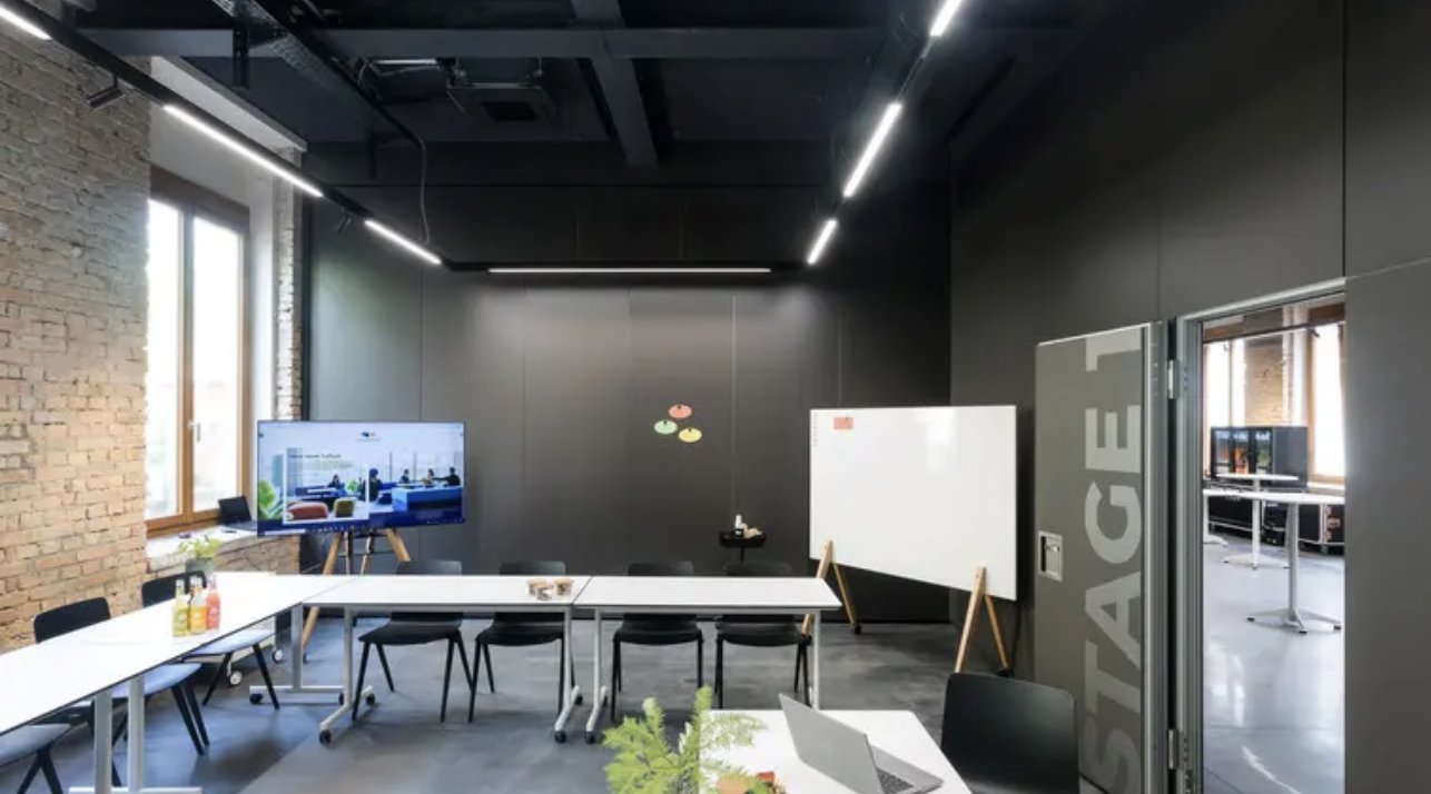 Die 50 qm große Stage 1 ist eine optimale Umgebung für kreative und fokussierte Meetings. Das agile Mobiliar bietet höchste Flexibilität, sodass sowohl eine Reihenbestuhlung, als auch ein Set Up für kleinere Gruppen möglich ist.